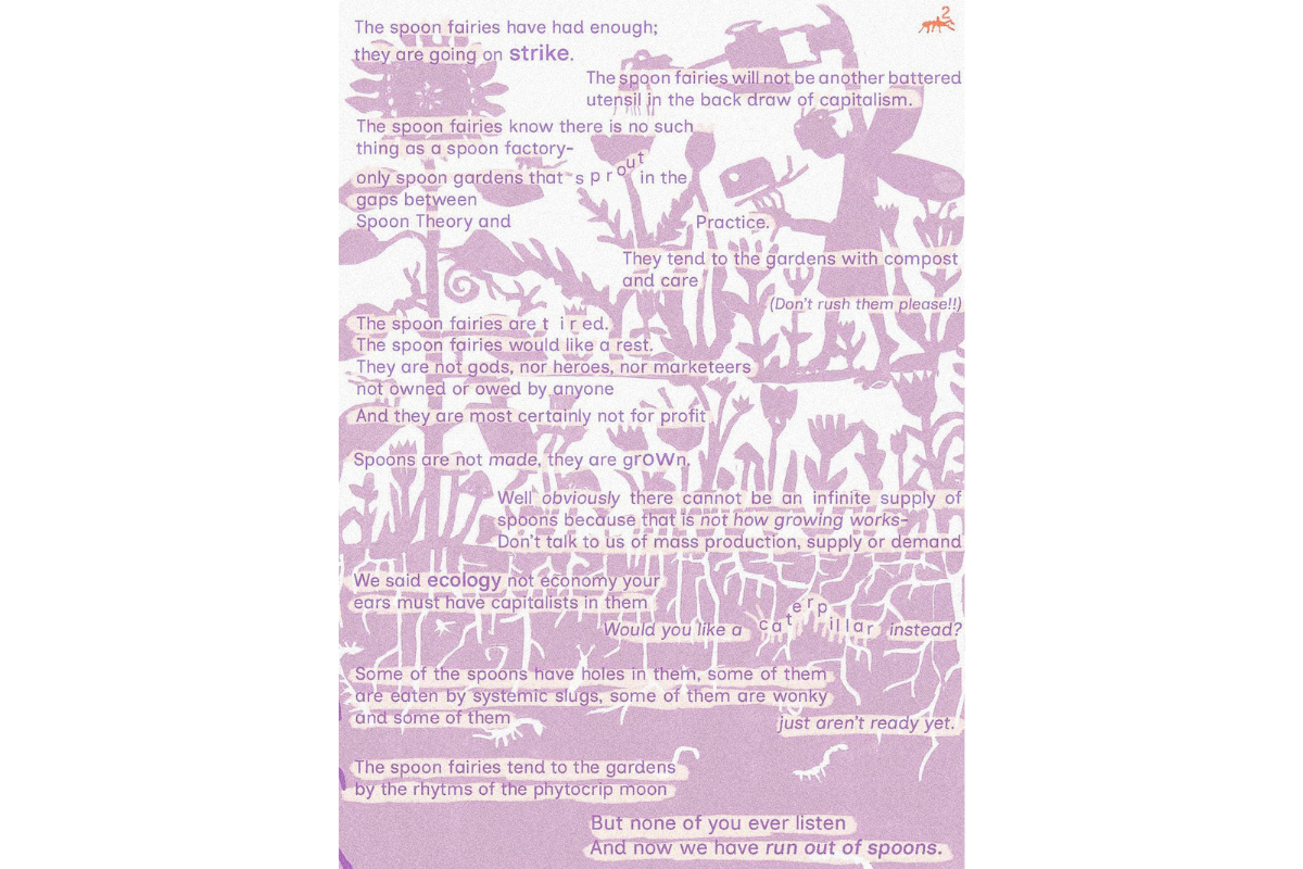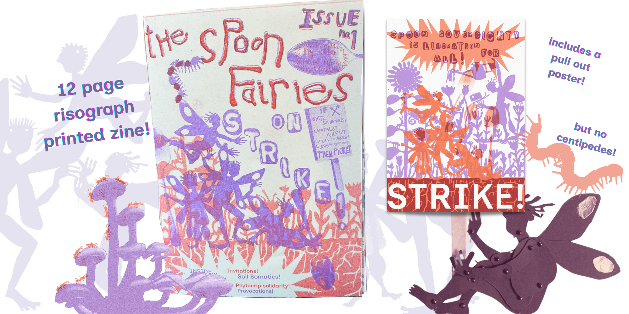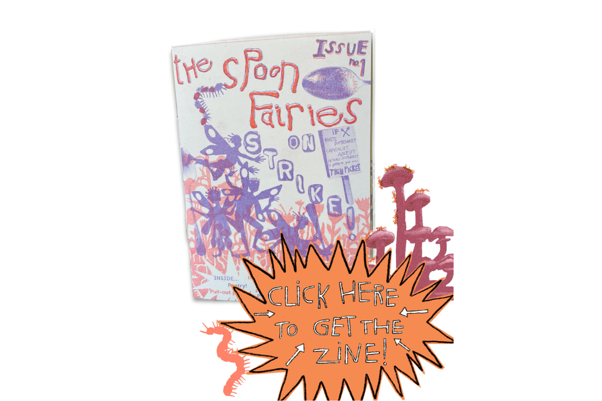 The Spoon Fairies have had enough of the chronic spoon shortages faced by the crip community due to the demands and systems of white supremacist, ableist, heteronormative capitalism. They are exhausted by the extractivist exploitation of an economy that inflames bodies, minds, and ecosystems. They have decided to go on strike, and this political pamphlet is one of their organising and educational strategies.